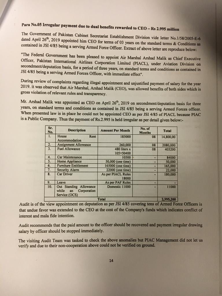 It was further claimed in the report that the PIA refused to assist the AGP's team, which is why it could not be determined as to how much Malik illegally gained in financial benefits. However, an estimate suggests that around Rs3 million were provided to him as allowances and entitlements during the eight months he remained the CEO.
