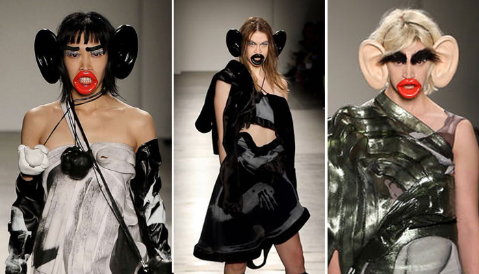 A prestigious New York fashion college apologized on Wednesday after a catwalk featuring models wearing large prosthetic red lips, ears and bushy eyebrows was branded racist.