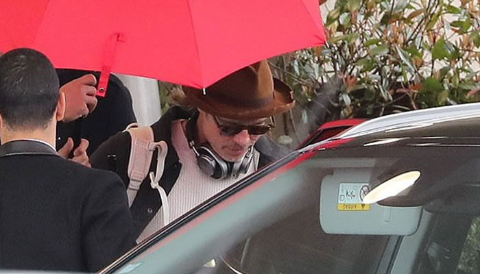 Brad Pitt apparently disguised as a rapper to go incognito when he stepped out of the airport in Paris on Tuesday underneath a large red umbrella to escape rain.