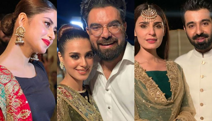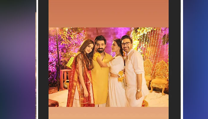 Sajal Ali, Iqra Aziz and Yasir Hussain on Friday graced the dholki event of the fellow stars Hassan Hayat Khan and Sadia Ghaffar, flaunting their dance moves on the beat of 'Tou Mera Hero'.