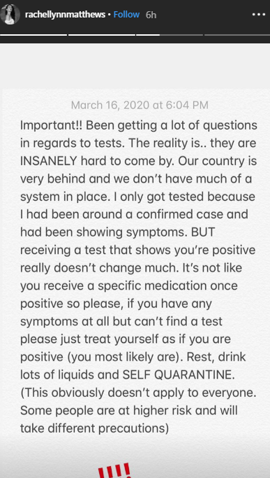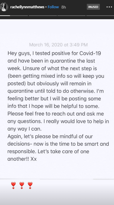 Encouraging her fans and followers to stay safe and keep others safe, Matthews stated: “Let’s please be mindful of our decisions – now is the time to be smart and responsible. Let’s take care of one another!! Xx.”