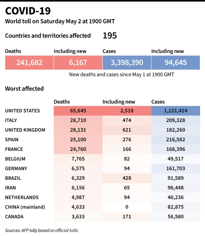 More than 243,000 people have been killed and 3.4 million infected worldwide by the virus, which has left half of humanity under some form of lockdown and pushed the global economy towards its worst downturn since the Great Depression.