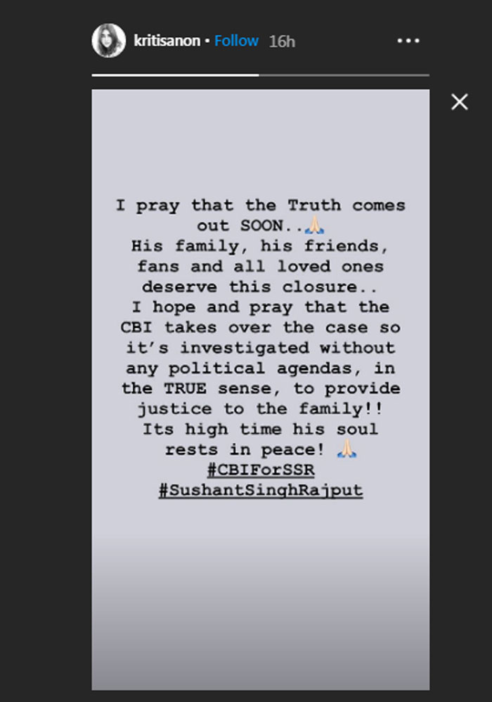 Earlier, Sushant’s Raabta co-star Kriti Sanon supported the CBI probe into the death of Rajput’s death case, saying “it's high time his soul rests in peace.”