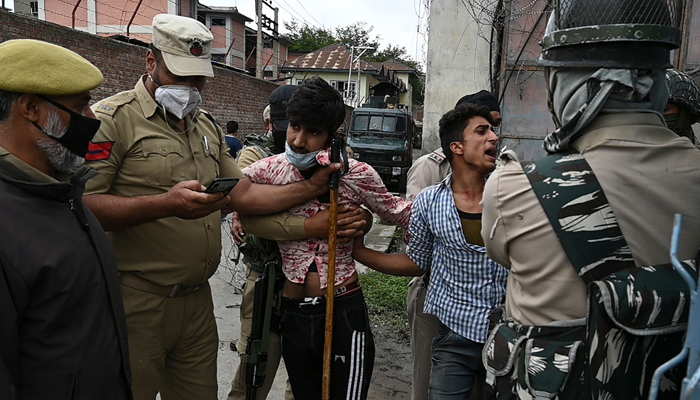 Kashmiri youths react while being detained by Indian police on August 28, 2020. — AFP/Tauseef Mustafa