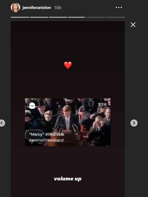 Taking to her Instagram stories, Jen shared a video clip of the Democratic president's speech from his inauguration in 1961.