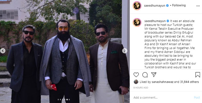 Sharing photos with their Turkish guest from their recent visit, Humayun Saeed wrote, “It was an absolute pleasure to host our Turkish guests; Mr Kemal Tekdin Executive Producer of blockbuster series Diriliş: Ertuğrul along with our beloved Cel Al, most popularly known as Abdul Rehman Alp and Dr Kashif Ansari of Ansari Films for bringing us all together.”