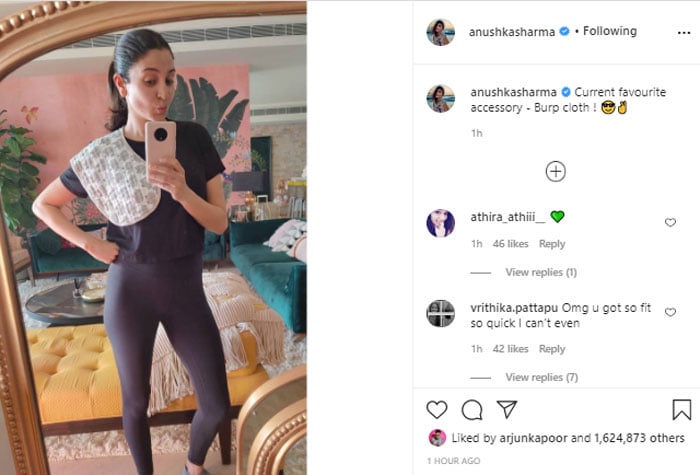 Dressed in black casuals, Anushka revealed her current favourite accessory and its burp cloth.