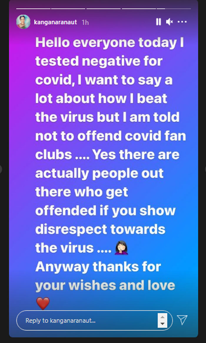 Kangana Ranaut wrote “Hello everyone. Today I tested negative for covid.”