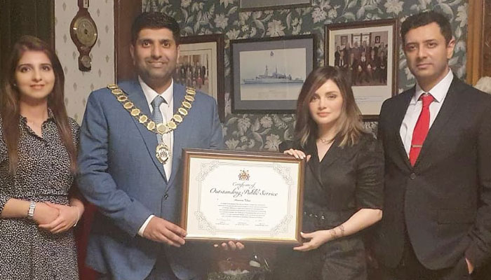 Pakistani actress Armeena Khan has received a certificate for outstanding public service in Britain, she revealed on social media.