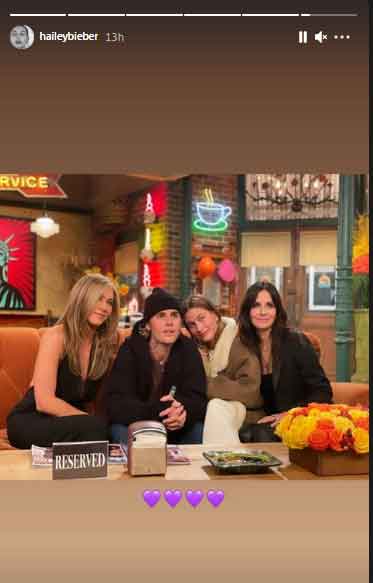 Hailey Bieber on Friday took to social media to share multiple pictures with her husband and "Friends" cast from the sets of the "reunion".