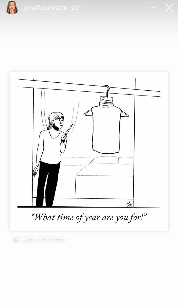 Turning to her Instagram Stories this week, the Murder Mystery star, 52, made fun of her staple fashion item from the comedy series, a mock turtleneck top that she also wore during the recent Friends reunion special.