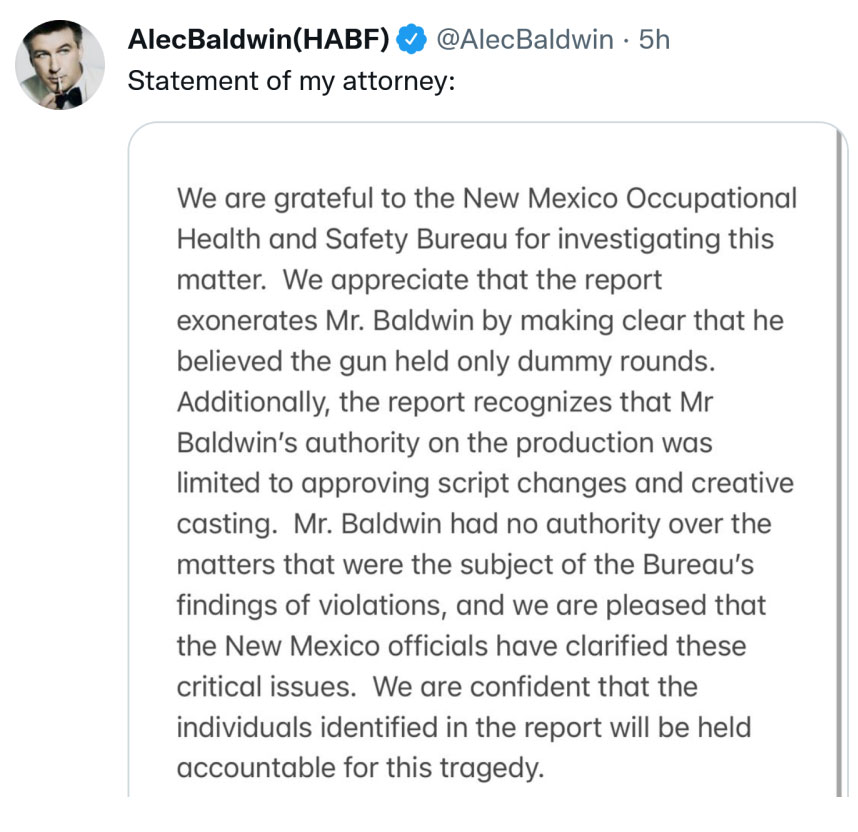 It reads, “we are grateful to the New Mexico Occupational Health and Safety Bureau for investigating this matter. We appreciate that the report exonerates Mr. Baldwin by making clear that he believed the gun held only dummy rounds.”