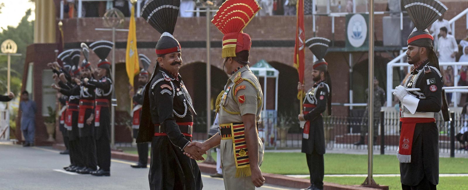 Thumbnail and header image: In this photograph taken on August 1, 2022, an Indian Border Security Force (BSF) soldier (C) and a Pakistani Ranger perform during the Beating the Retreat ceremony at the India-Pakistan Wagah border post, about 35 km from Amritsar. — AFP