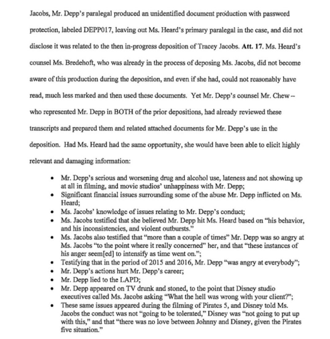 The document also added, “Ms. Heard's counsel Ms. Bredehoft, who was already in the process of deposing Ms. Jacobs, did not become aware of this production during the deposition, and even if she had, could not reasonably have read, much less marked and then used these documents.”