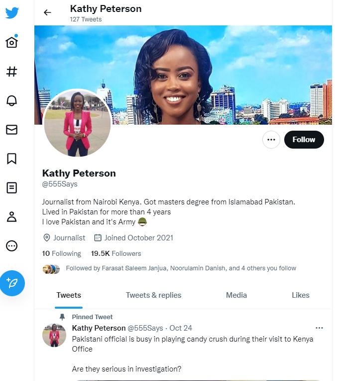 A Twitter account, with the name Kathy Peterson, has over 19,000 followers and claims to belong to a journalist in Kenya.
