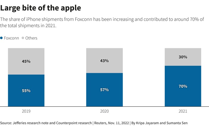 The factory, which makes Apple devices including the iPhone 14 Pro and Pro Max, accounts for 70% of iPhone shipments globally.