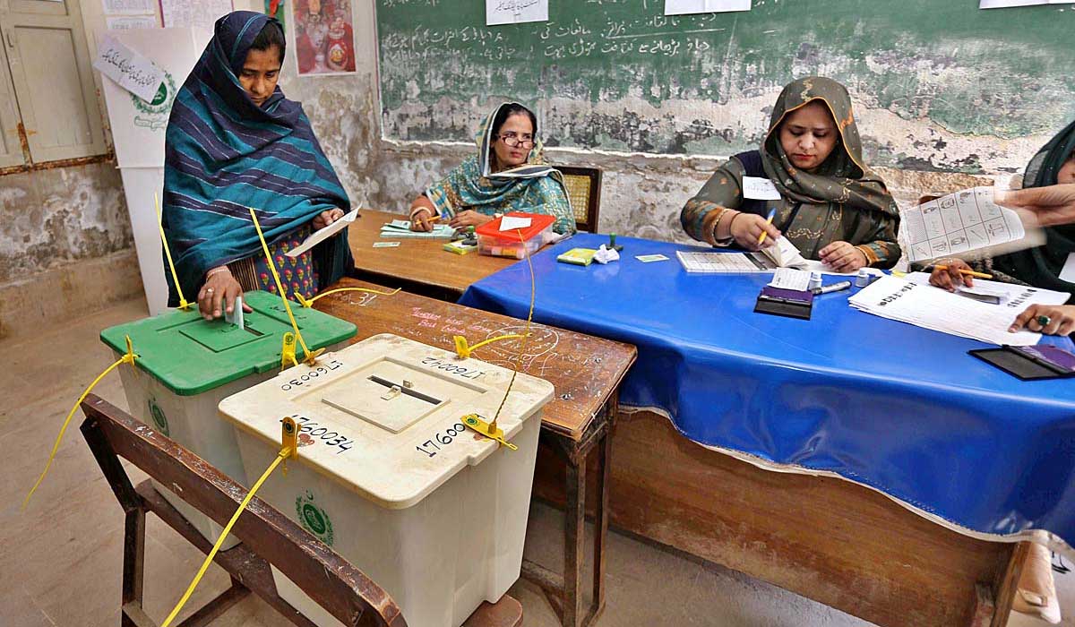 Polling takes place inside a women's polling booth in Karachi. — Geo.tv/Rana Jawaid