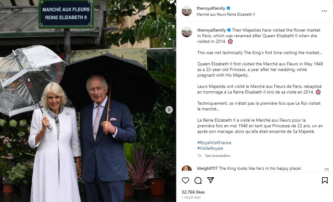 King Charles and Queen Camilla visited the flower market in Paris, which was renamed after Queen Elizabeth when she visited in 2014.