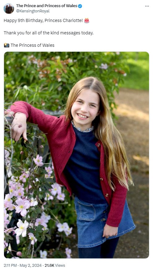 Even the caption reads, “Happy 9th Birthday, Princess Charlotte! [birthday cake emoji] Thank you for all of the kind messages today.”
