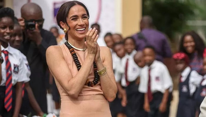 The Duchess of Sussex, who flew to the Abuja airport from Heathrow alongside Prince Harry this week, left devotees stunned as she donned a beige sleeveless ensemble.