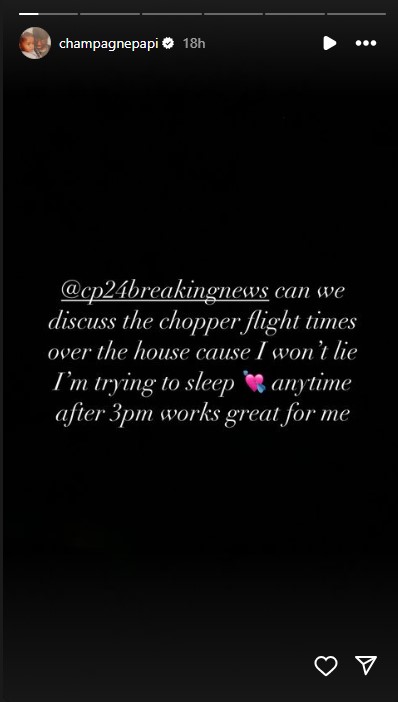 Shortly after, Drake expressed frustration on Instagram over the presence of news helicopters over his property after the series of police-involved events.