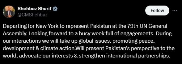 "Departing for New York to represent Pakistan at the 79th UN General Assembly. Looking forward to a busy week full of engagements. We will present Pakistan's perspective to the world," the PM said in a post on X.
