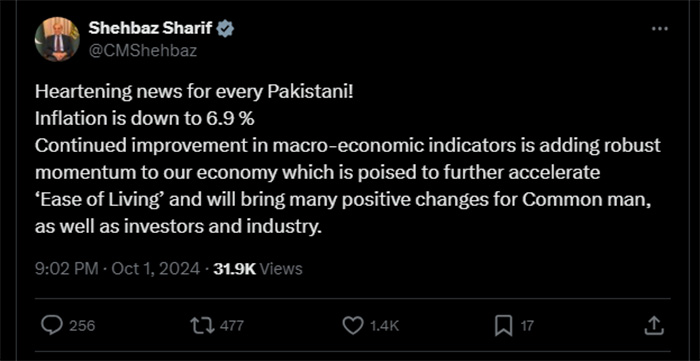 Reacting to the development, Prime Minister Shehbaz Sharif wrote on X: "Heartening news for every Pakistani! Inflation is down to 6.9%."