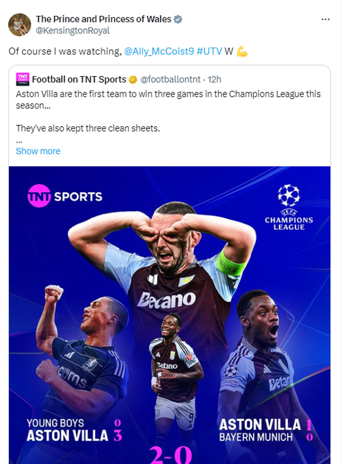 The future king retweeted the Football on TNT Sports account on X, and said: "Of course I was watching, @Ally_McCoist9."