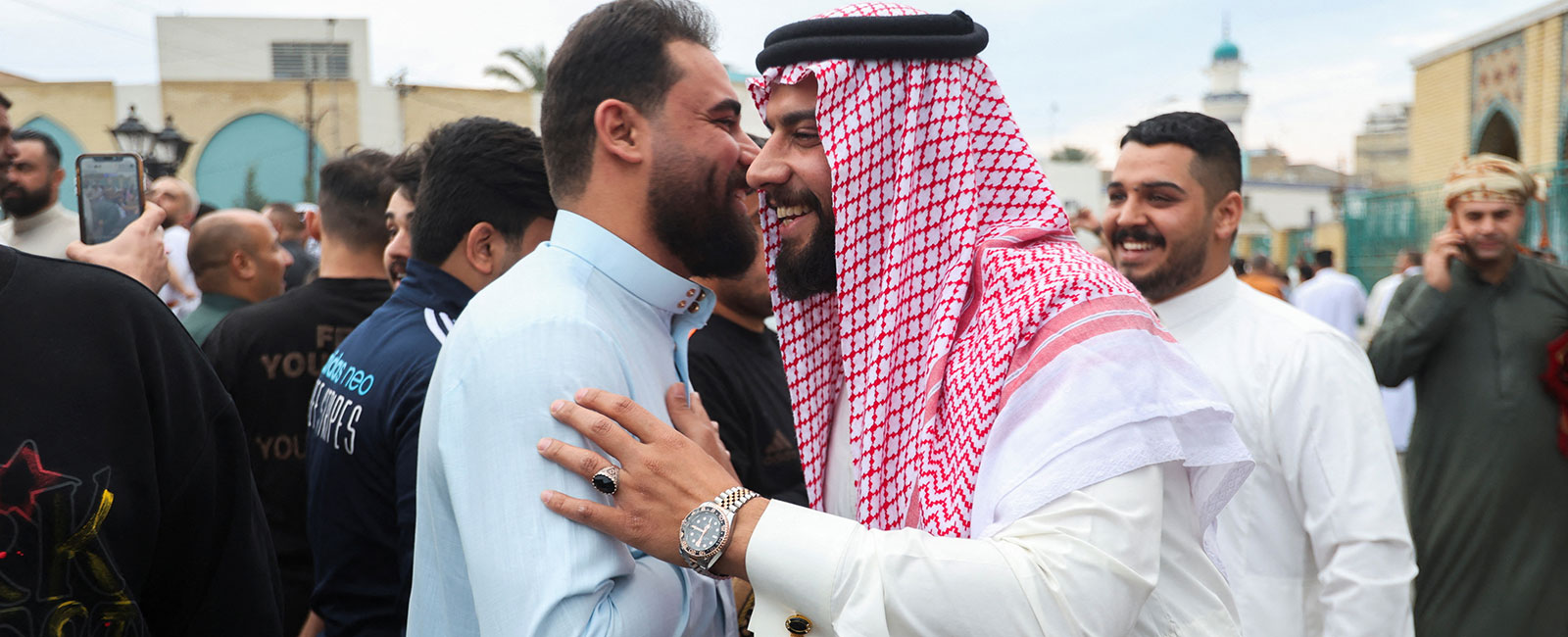 People exchange greetings after Eid prayer on a street in Baghdad, Iraq, on March 30, 2025. — Reuters