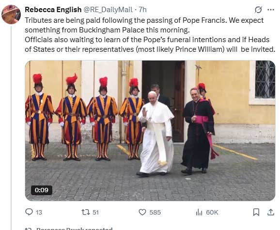 Taking to X, formerly Twitter, British journalist Rebecca English wrote "We expect something from Buckingham Palace this morning. Officials also waiting to learn of the Pope’s funeral intentions and if Heads of States or their representatives (most likely Prince William) will be invited."