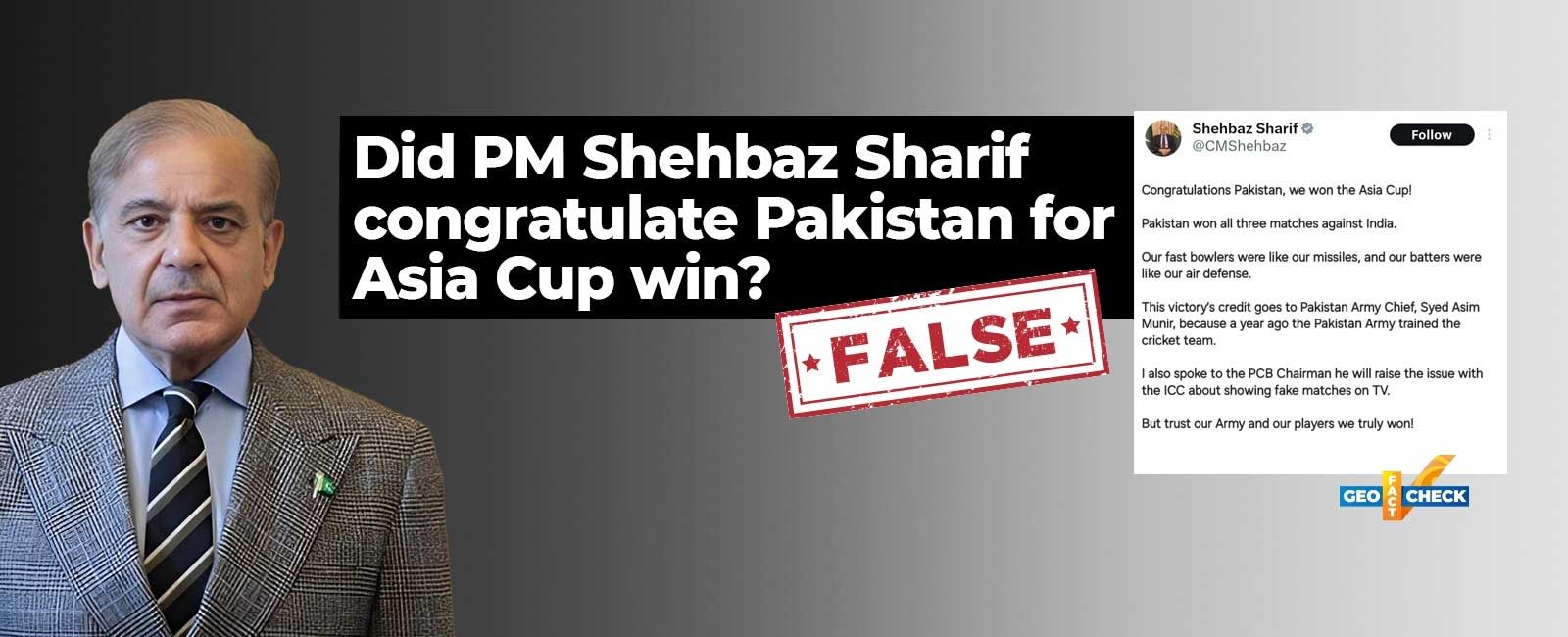 Social media is circulating a screenshot of a supposed post on X (Twitter) by Pakistan Prime Minister Shehbaz Sharif congratulating his country's cricket team on winning the Asia Cup trophy, despite team's loss, and further crediting the victory to training provided by the Pakistan Army.