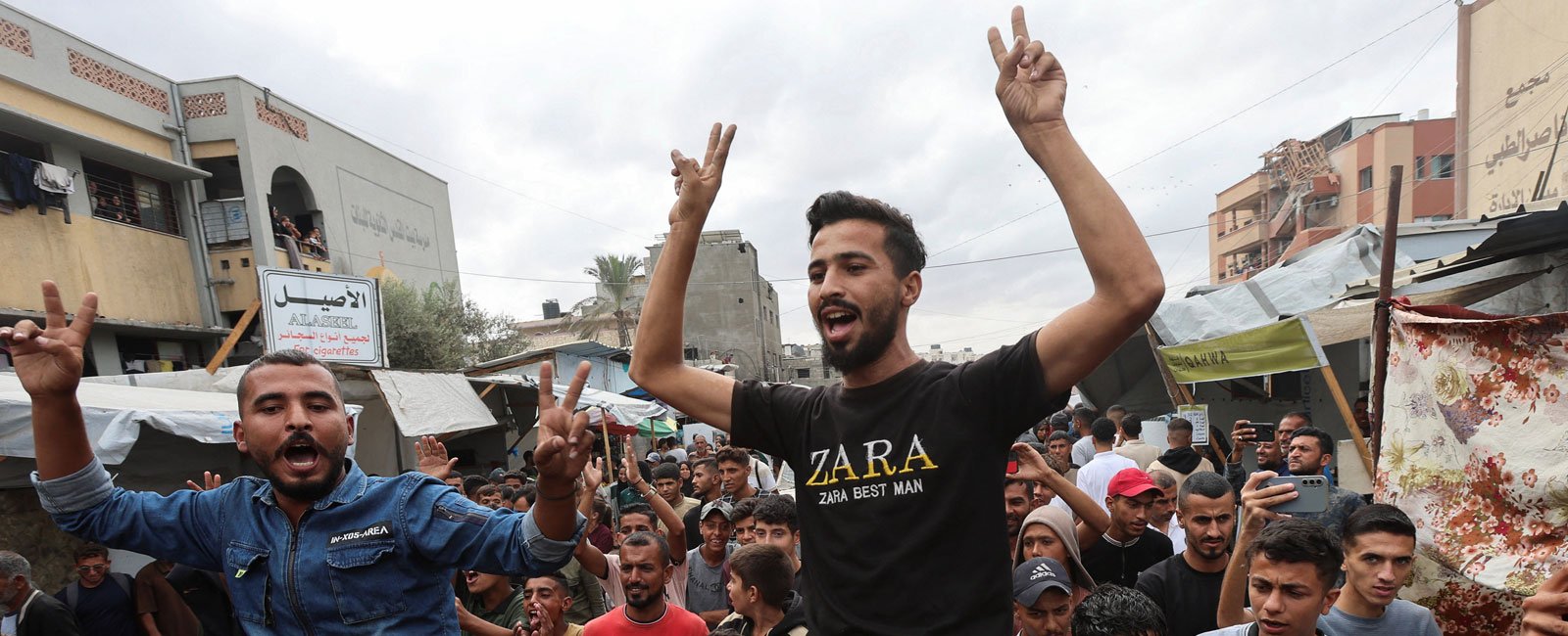 A crowd of around a dozen young men shouted joyful chants of "Allahu akbar", meaning God is the greatest, outside Khan Yunis’s Nasser Hospital, as one man lifted another onto his shoulders.