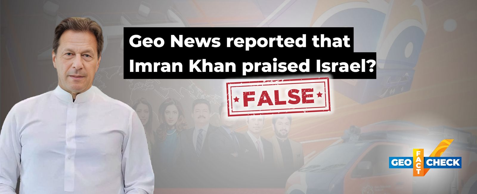A graphic designed to resemble a Geo News bulletin is circulating online, claiming that the channel aired a report in which it attributed a pro-Israel statement to Pakistan Tehreek-e-Insaf (PTI) founder and former prime minister Imran Khan.