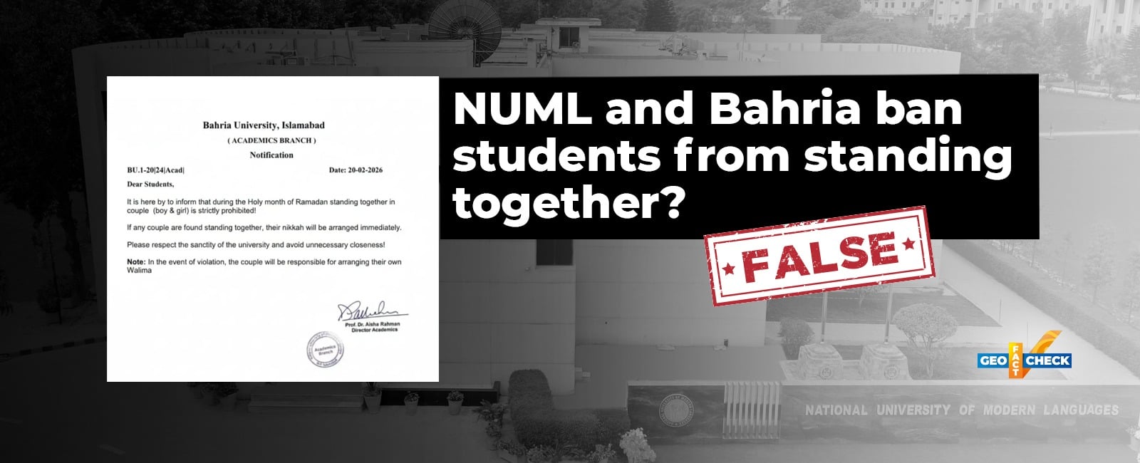 Following the start of the holy month of Ramadan in February, a claim circulated online alleging that the National University of Modern Languages (NUML) and Bahria University had warned female and male students not to stand together during the month.