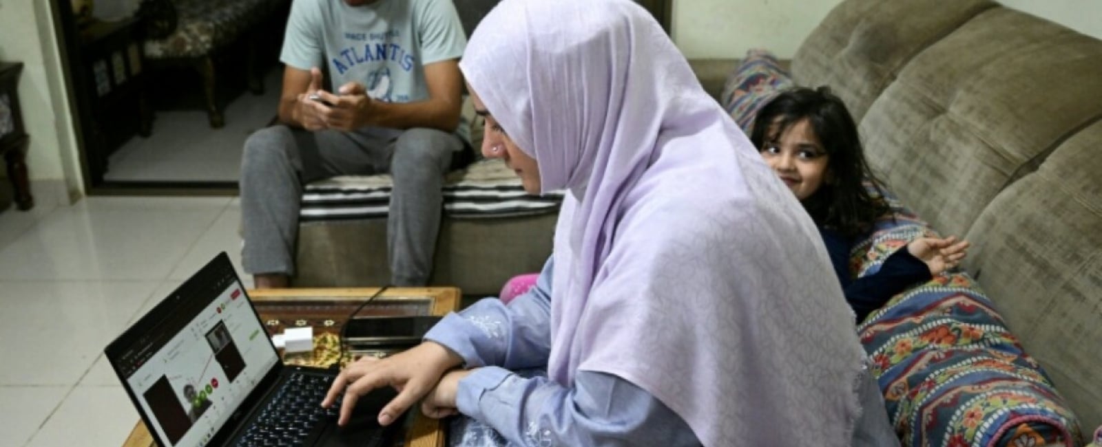 Header image caption: Dr Saniya Jafri conducts an online consultation, alongside her daughter in Karachi, in this undated image. — AFP