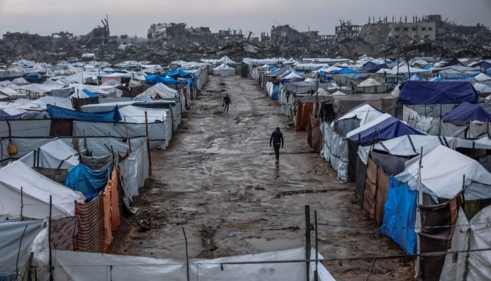 Men walk along a muddy alley at a makeshift camp sheltering displaced Palestinians after heavy rains in the Zeitoun neighbourhood of Gaza City on December 11, 2025. — AFP - Storm Byron caused the deaths of at least 14 Palestinians in Gaza after already-damaged structures gave way, leaving people exposed with nothing more than fragile tents for protection.