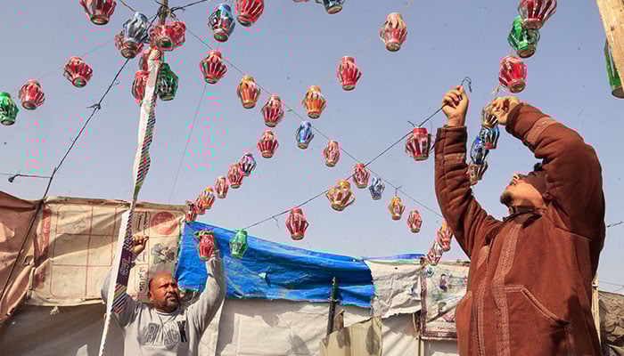 Mohannad al-Najjar hangs Ramadan lanterns made from recycled tin cans on strings between tents, in Khan Younis in the southern Gaza Strip on February 15, 2026. — Reuters