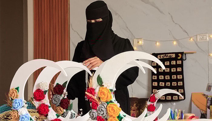Palestinian woman Fatma Abou Hatab displays handmade Ramadan decorations using a crochet and simple materials, in Deir al-Balah in the central Gaza Strip on February 14, 2026. — Reuters