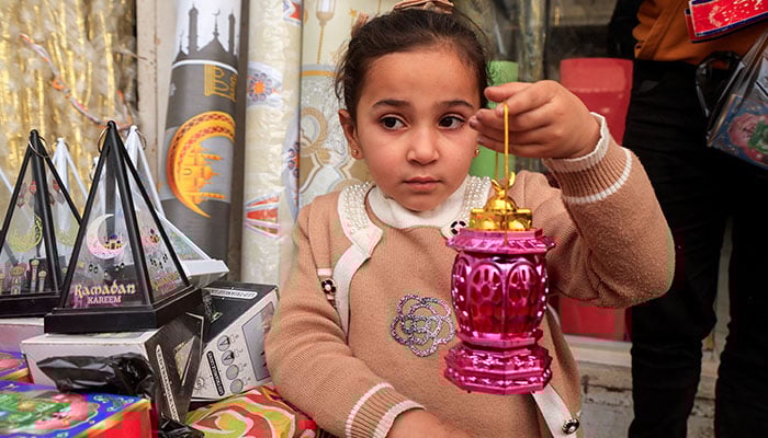 A Palestinian girl holds a Ramadan lantern at a market where seasonal decorations are sold, in Khan Younis in the southern Gaza Strip on February 14, 2026. — Reuters