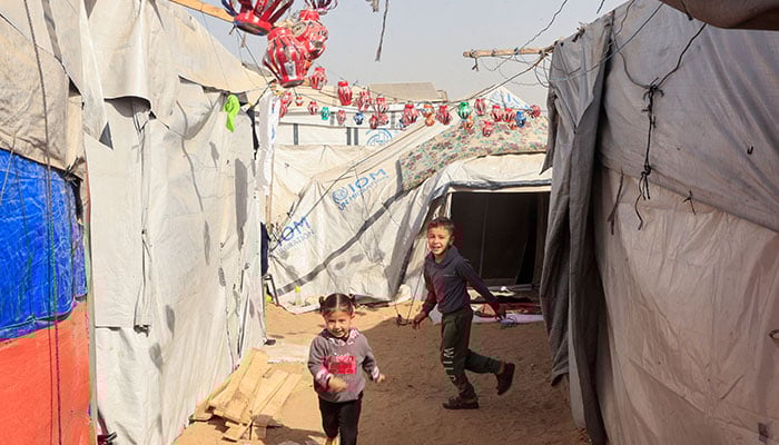 Palestinian children play among tents decorated with handmade Ramadan lanterns, in Khan Younis in the southern Gaza Strip on February 15, 2026. — Reuters