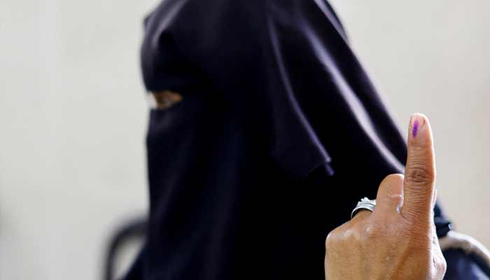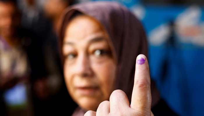 A Palestinian woman shows her inked finger after voting during the municipal election at a polling station in Deir al-Balah, central Gaza Strip April 25, 2026.— Reuters
