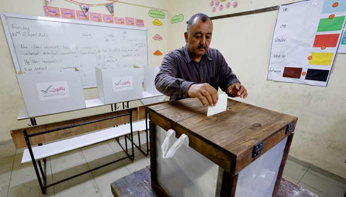 A Palestinian man votes during the municipal election at a polling station in Deir al-Balah, central Gaza Strip April 25, 2026.— Reuters