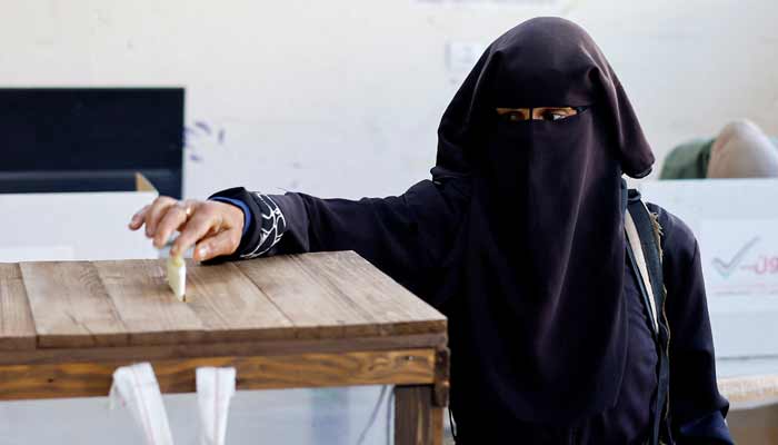 A Palestinian woman votes during the municipal election at a polling station in Deir al-Balah, central Gaza Strip April 25, 2026.— Reuters -